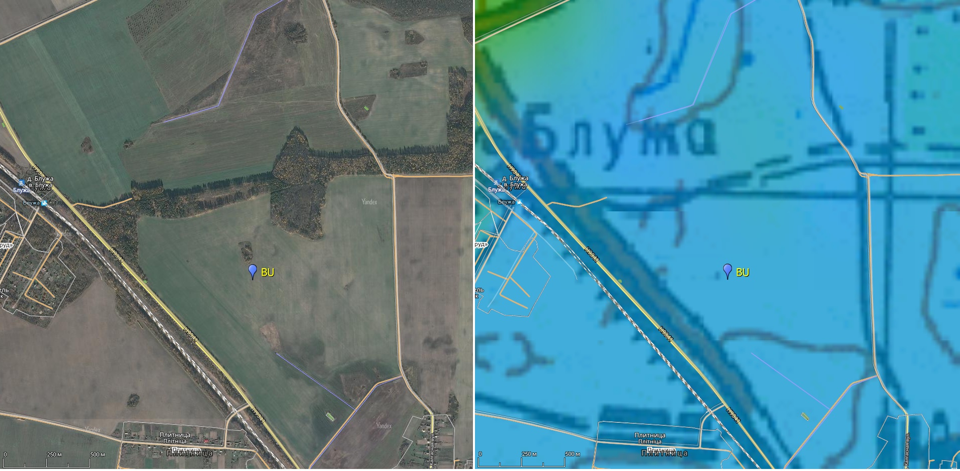 Наблюдательная площадка BU была разведана в ходе 13-й Одиссеи в поисках тёмных площадок 22 июля 2013 г. Площадка находится вблизи ж/д станции Блужа. Площадка представлена двумя полями: прямо на восток от станции находится широкое северное поле, а за перелеском южнее этого поля -- южное, с повышением к центру. Попасть на южное поле можно по дороге от станции, идущей через перелесок на восток.