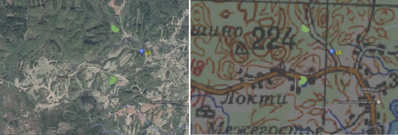 Наблюдательная площадка LK была разведана в ходе выезда на наблюдения 23 сентября 2017 г. Дорога до Россон в хорошем состоянии, от Россон до д. Локти -- в удовлетворительном. Площадка представляет собой цепь холмов, окружённых с юга на восток деревнями Гришино - Локти - Мамоли. Самый высокий холм находится севернее д. Локти (высота 224 м), но заехать на нём на сашине не получилось из-за разбитой дороги. Восточнее д. Локти на повороте к д. Мамоли расположен более удобный для заезда холм, на котором и проводились наблюдения.