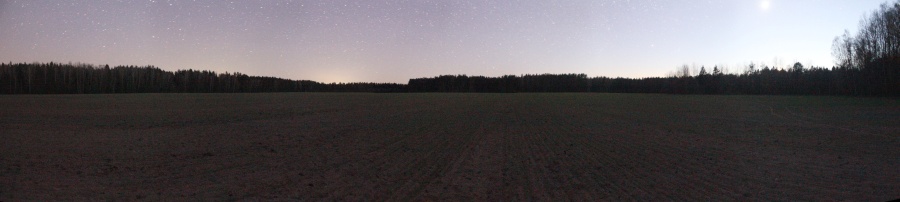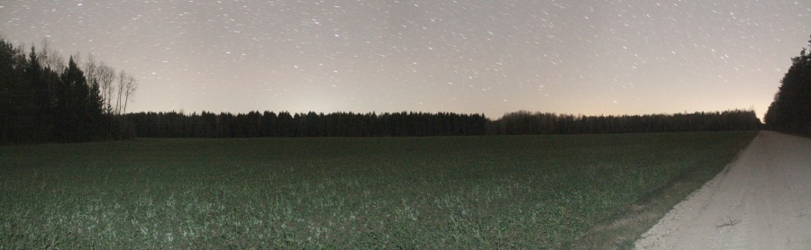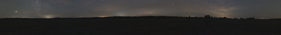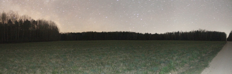 В ходе выезда на наблюдения 25-26 апреля 2020 г. были разведаны три дополнительных поля, по дороге из д. Лежневичи в Черневичи. Все три поля окружены лесом от локальной засветки и достаточно удалены (более 1,5 км) на юго-запад от деревень. На поле в точке 53o 53' 23.0"N, 26o 02' 07.0"E были проведены наблюдения deep-sky объектов и измерена засветка, которая оказалась практически самой низкой на июль 2020 г. Ниже приведена панорама этого поля.