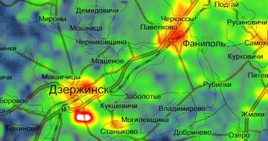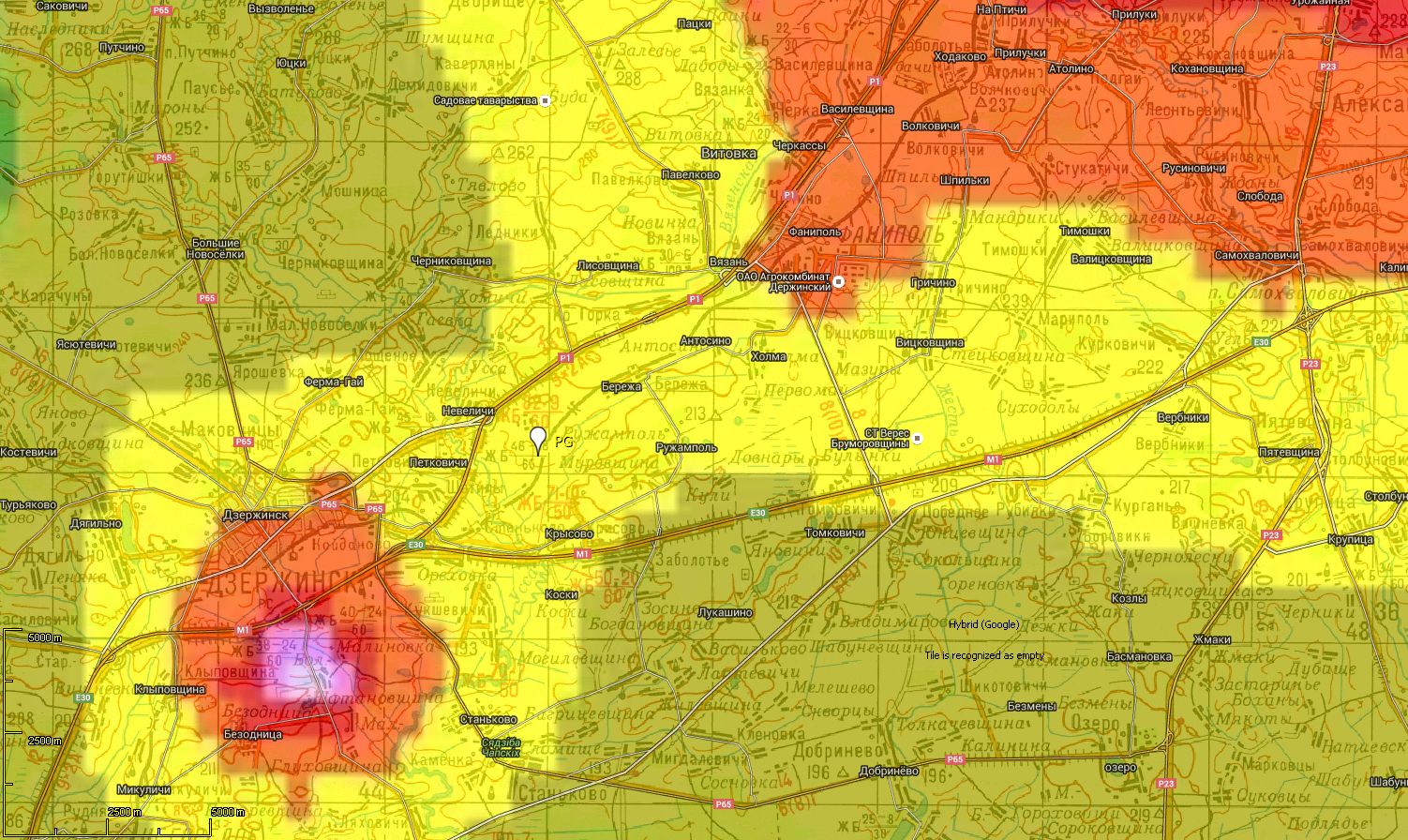 Площадка "PG" находится в жёлтой зоне засветки. На северо-востоке виден широкий купол засветки от Фаниполя, на юго-западе -- небольшой купол от Дзержинска.