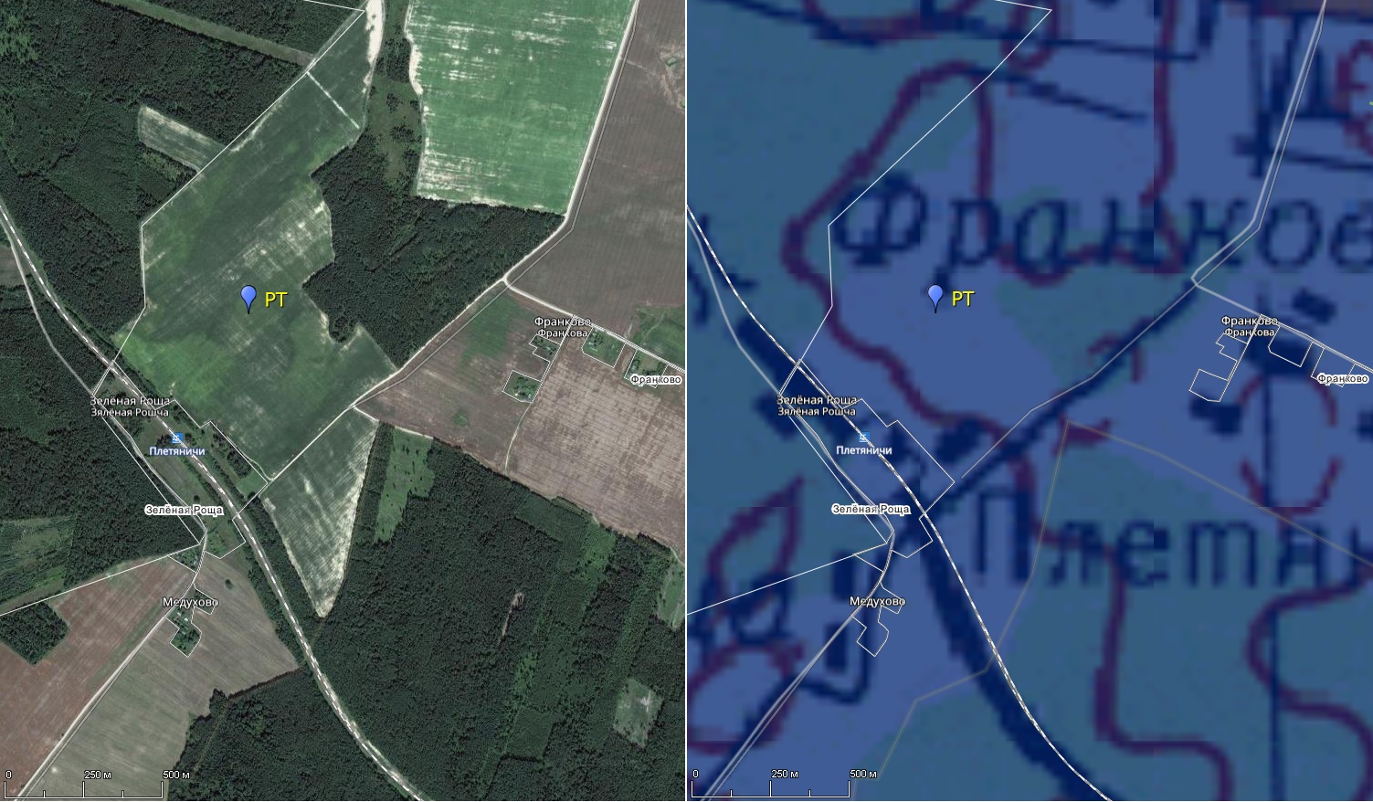 Наблюдательная площадка PT была разведана в ходе 25-й Одиссеи в поисках тёмных площадок 26-27 января 2018 г. Площадка находится за о.п. Плетяничи на северо-восток. Поле имеет размеры 1000х500 м. Более возвышенная часть поля находится на северо-западе.