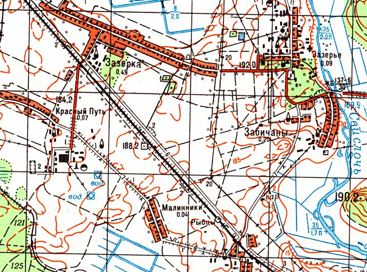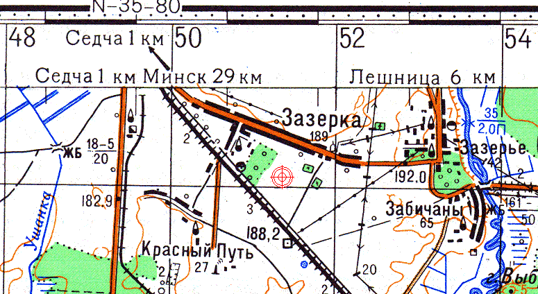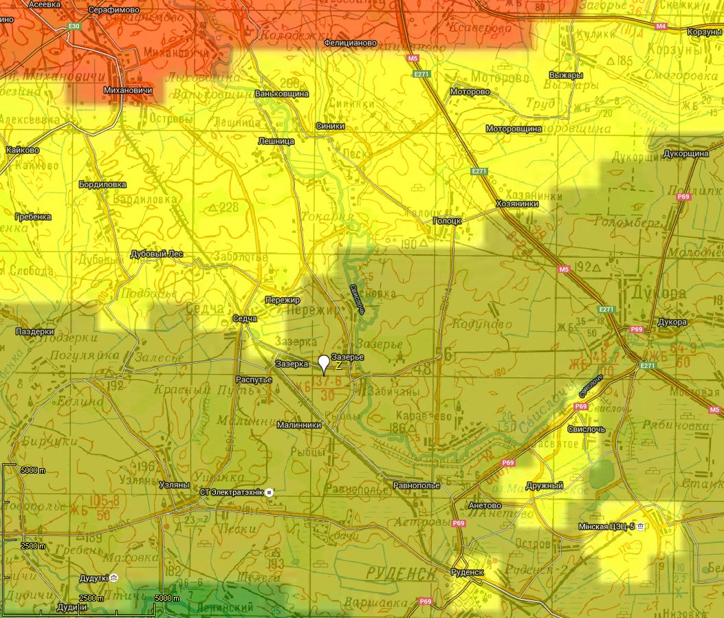 Как и астроплощадка в Красном Знамене (KZ), астроплощадка в Зазерке (Z, Осиповическое направление ж/д) давно используется нами для выездов. От станции надо пройти метров 200 по ходу движения электрички и, перейдя ж/д пути, свернуть на восток. Пройдя метров 300 по дороге, выходим на большое поле, окружённое поселениями. Место с бОльшим уровнем засветки, чем Красное Знамя, однако предельное визуальное проницание в 5m,5 в зените достигается без проблем. Поле часто вспахано, но в не зимнее время можно распологаться на просёлочной дороге.