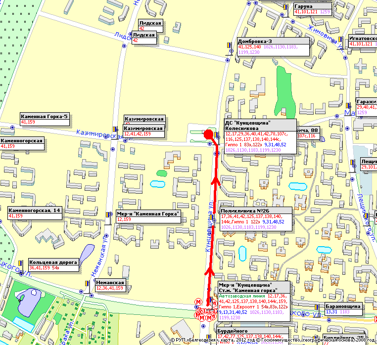 Как добраться: Едем до ст. метро "Каменная горка", выходим в сторону ул. Кунцевщина. Садимся на автобус/троллейбус (номера маршрутов см. ниже на рисунке) и едем две остановки -- до ДС "Кунцевщина". За ДС начинается поле -- это и есть KG.